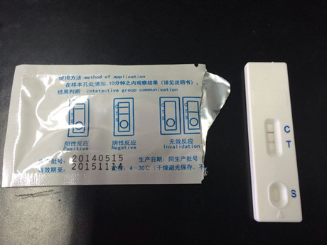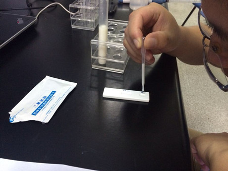 3、吸取待測樣品溶液,緩慢滴加80~100μl(約3~4滴)樣品液于加樣孔中,開(kāi)始計時(shí),在3~5分鐘內讀取結果。