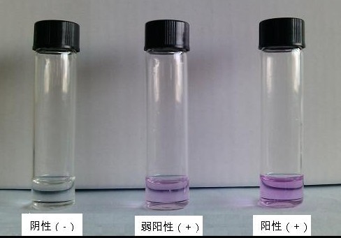 2min 內觀(guān)察顏色變化,若溶液出現粉紅至紫紅色,則判為陽(yáng)性(+);無(wú)色判為陰性(-)。