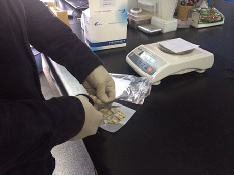 1、稱(chēng)取剪碎的樣品1.25g至25mL比色管中。