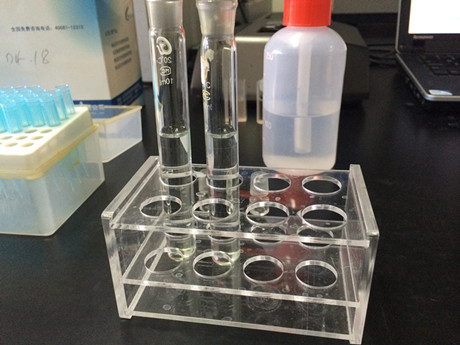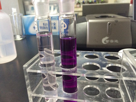 4、取一支10mL比色管,加入1mL樣品液,加入C溶液80μL,加蒸餾水至10mL刻度線(xiàn),加入D溶液0.5mL,搖勻,開(kāi)蓋靜置10min。