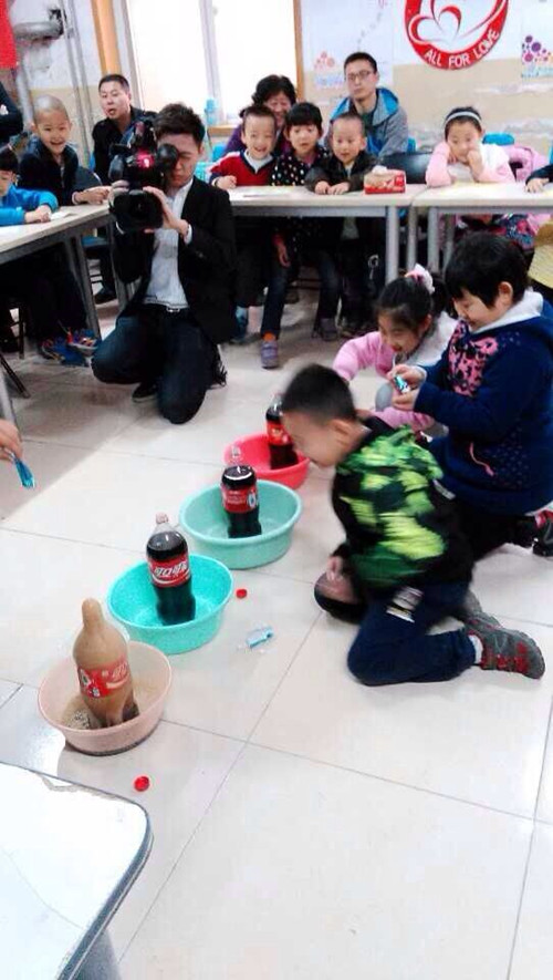 小朋友們在可樂(lè )中放入了幾顆神秘物體,只見(jiàn)樂(lè )可瞬間噴射出來(lái),小朋友和家長(cháng)的驚呆了。
