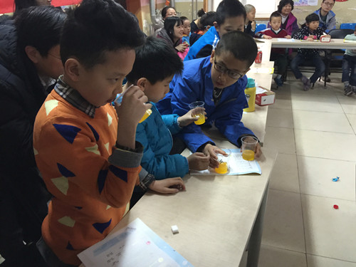 老師將事先調配好的果汁和從市場(chǎng)購買(mǎi)的果汁讓家長(cháng)和小朋友們用感官來(lái)鑒別,猜錯的還真不少。