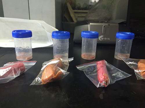 首先我們將吳先生提供的兩種樣品分別進(jìn)行編號,并進(jìn)行少量切割稱(chēng)重,稱(chēng)取1.0g火腿樣本,加入10ml蒸餾水;