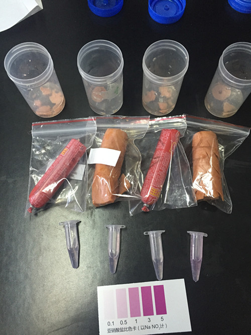 通過(guò)觀(guān)察我們可以發(fā)現2號相對顏色較深,其他顏色基本不變,這個(gè)說(shuō)明路邊烤腸中亞硝酸鹽含量超標,而商場(chǎng)火腿亞硝酸鹽含量基本符合標準;