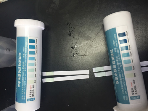 之后進(jìn)行水中余氯和雙氧水檢測,用吸管吸取少量水樣,滴加到試紙條的顯色區域,靜置1分鐘后與對比條進(jìn)行顏色比對。