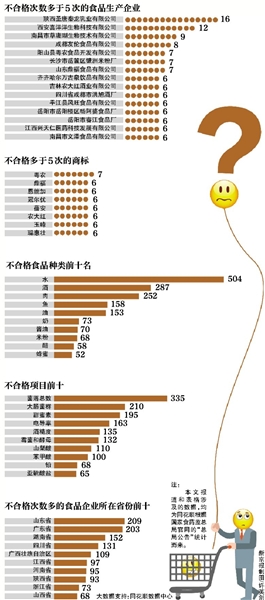 根據新京報統計,自今年1月1日至11月26日,國家食藥監總局在“總局公告”里公布了3600余批次不合格食品,有具名的“生產(chǎn)企業(yè)”2293家。根據同花順數據中心分析,449家企業(yè)被通報2次(含)以上,占19.6%。而被通報達5次及以上的企業(yè)數量為29家,占具名生產(chǎn)企業(yè)總數的1.3%。