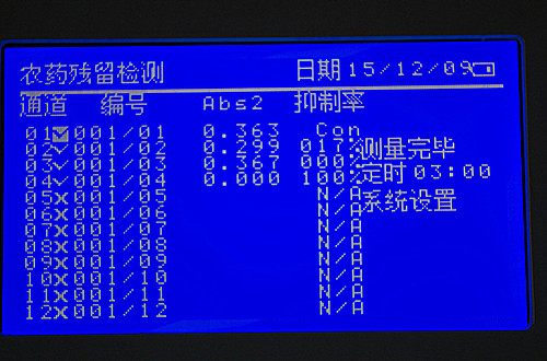 檢測結果如圖所示,結果以酶被抑制的程度,即抑制率表示。當果蔬樣品提取液對酶的抑制率為40~50%時(shí),則表明被測樣品為可疑農殘超標樣品;當抑制率≥50%時(shí),表示蔬菜中有高劑量有機磷或氨基甲酸酯類(lèi)農藥存在,樣品為陽(yáng)性結果。
