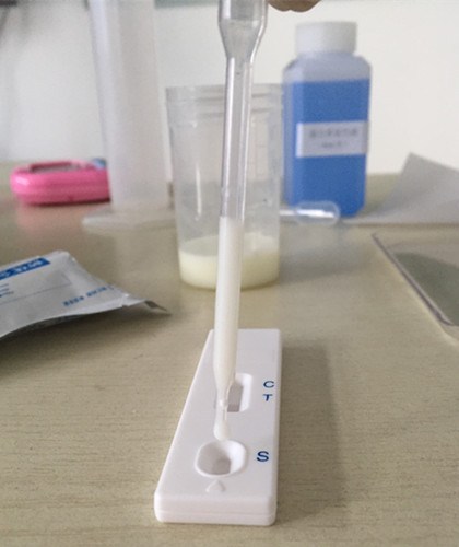 用干燥、潔凈的比色管盛放奶粉,用純凈水1:10稀釋?zhuān)?份奶粉+10份純凈水),溶解后用于檢測。