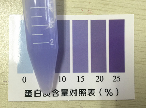 取4 mL顯色液加入比色管中,蓋上蓋,用力將奶粉全部搖溶,顯色3分鐘,在3~5分鐘內將比色管襯在白紙上與標準比色卡進(jìn)行對比,找出與乳粉蛋白質(zhì)標準比色卡上相近的色階,即為每100g乳粉樣品中蛋白質(zhì)的含量。