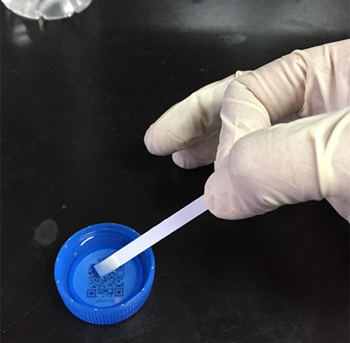 取適量樣品于潔凈干燥容器,將試紙塊全部浸入樣液后立即取出。