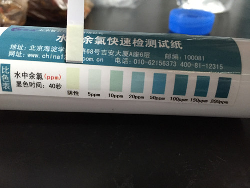 擦掉試紙邊緣多余液體,試紙塊朝上水平放置,40秒時(shí)與色卡比較,讀取結果。結果顯示余氯符合國家標準。