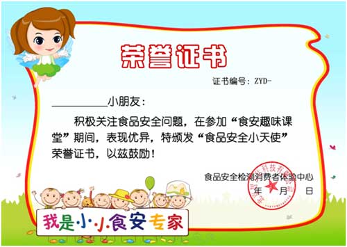 活動(dòng)結束后,我們體驗中心的老師還為參加活動(dòng)的同學(xué)準備了食安天使小證書(shū)。我們的趣味課堂不是要大家不要吃零食,遠離帶有色彩的食品,而是讓大家知道這些食品中可能隱藏的健康危害,適量食用,最后同學(xué)們都收獲滿(mǎn)滿(mǎn)。