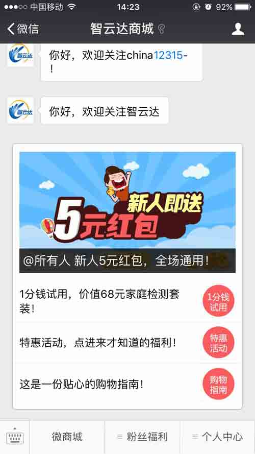 然后點(diǎn)擊關(guān)注頁(yè)面左下角“微商城”,即可進(jìn)入商城。商城最新推出各種優(yōu)惠活動(dòng)和優(yōu)惠券,微商城開(kāi)業(yè),一大波優(yōu)惠券瘋狂送,即日起至12月30日,凡進(jìn)店新人享5元紅包,全場(chǎng)通用。同時(shí)您可以在搜索框中輸入產(chǎn)品名稱(chēng)或關(guān)鍵詞,快速查找您要購買(mǎi)的產(chǎn)品,點(diǎn)擊購買(mǎi)即可。