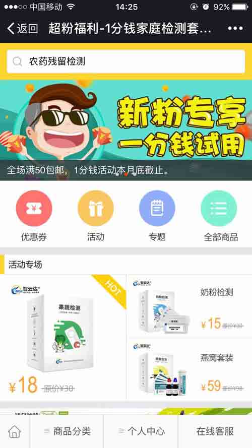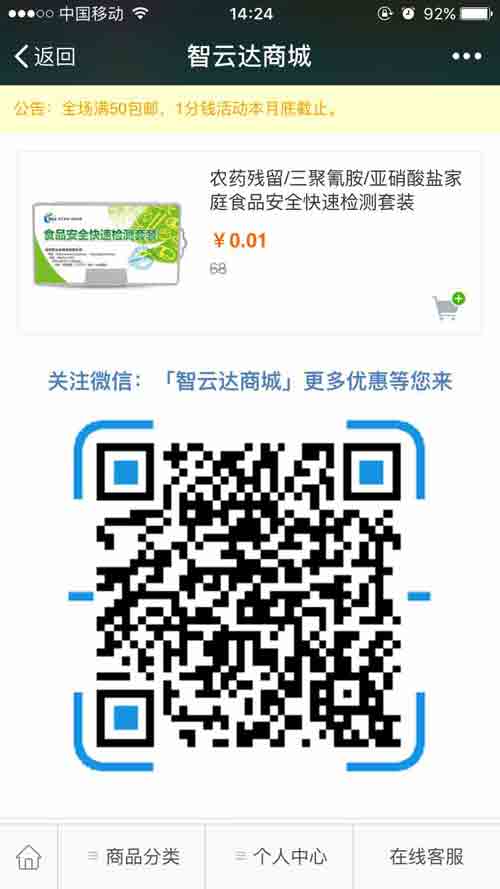 當下微信人群活躍度高,微商城的開(kāi)通為消費者在隨時(shí)隨地選購食品安全快速檢測產(chǎn)品開(kāi)通一條更為優(yōu)惠、方便的購物通道。那么如何在智云達商城購買(mǎi)產(chǎn)品?