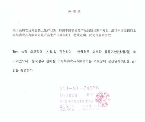 12月20日,1號店方面向澎湃新聞?dòng)浾哒f(shuō)明,韓國廠(chǎng)家確認了國內經(jīng)銷(xiāo)商的說(shuō)法,出口巢尚食品的湯姆農場(chǎng)產(chǎn)品外包裝所標日期為生產(chǎn)日期,并出具了說(shuō)明函。