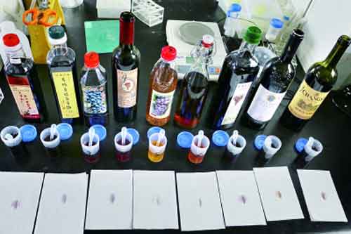 檢測結果: 9個(gè)樣品 兩個(gè)未檢出葡萄成分,5號、6號樣品沒(méi)有葡萄中應有的花青素成分,證明沒(méi)用葡萄釀制,5號、6號樣品來(lái)源為微店。