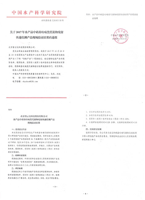 中國水產(chǎn)科學(xué)研究院質(zhì)量與標準研究中心受農業(yè)部漁業(yè)漁政管理局委托 ,運用智云達自主研發(fā)的水產(chǎn)品快檢產(chǎn)品,對水產(chǎn)品中硝基呋喃類(lèi)代謝物進(jìn)行快速檢測。2017年10月23日-24日,該檢測在國家水產(chǎn)品質(zhì)檢中心順利開(kāi)展。驗證結果如下: