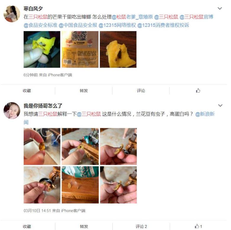 中新經(jīng)緯客戶(hù)端在微博上看到,不僅是劉洋和阿維,其他消費者也表示曾在三只松鼠的產(chǎn)品中吃出過(guò)蟲(chóng)子。