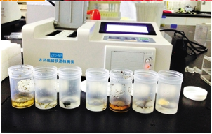 實(shí)驗過(guò)程:實(shí)驗人員分別稱(chēng)取2克茶葉樣品,加蒸餾水泡開(kāi)茶葉。然后加農殘緩沖溶液、顯色劑、酶試劑等,搖勻靜置10分鐘后放進(jìn)檢測儀。儀器屏幕上便顯示出農殘抑制率數據。
