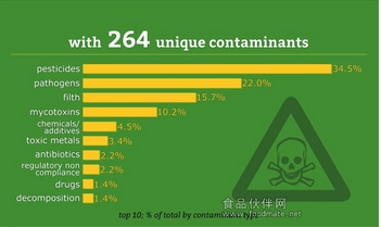 統計數據還顯示,出問(wèn)題的食品包括:海鮮(23.5%)、蔬菜(20%)、水果(13.8%)、香菜/調味品(8.9%)、乳品(7.5%)。食品違規類(lèi)型包括農殘(34.5%)、病菌(22.0%)、污物(15.7%)、真菌毒素(10.2%)、化學(xué)物質(zhì)/添加劑(4.5%)。