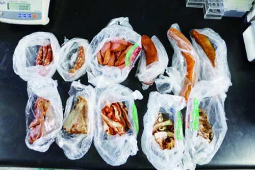 街邊熟食店、市場(chǎng)熟食攤購買(mǎi)的香腸4份、臘腸2份、肘子1份、豬頭肉2份、豬耳朵1份、豬蹄1份。