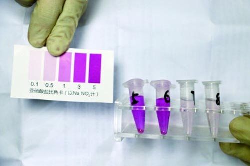 11個(gè)樣品檢測液顏色均有變化,均檢出亞硝酸鹽成分。其中5號、6號呈現紫紅色,亞硝酸鹽含量最高,45mg/kg,高于預包裝熟食不得超過(guò)30mg/kg的國家限量標準。