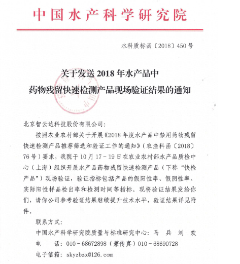這次智云達驗證的快檢產(chǎn)品呋喃四項、氯霉素、孔雀石綠膠體金檢測卡的檢測限分別為0.5 ng/g、0.1 ng/g和2 ng/g,符合國內市場(chǎng)及國家食藥總局KJ的標準要求,可為水產(chǎn)品質(zhì)量安全的監管和檢測提供有效的檢測手段。