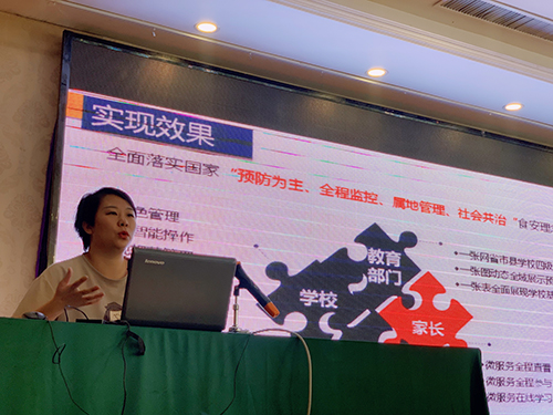北京智云達資深產(chǎn)品經(jīng)理錢(qián)瑞,為各位參訓學(xué)員分享了智云達在校園餐飲食品安全保障中的智能化解決方案,得到了省教育廳領(lǐng)導的認可。智云達作為國內領(lǐng)先的食品安全快檢產(chǎn)品、檢測服務(wù)以及信息化構建的供應商及服務(wù)商,為校園餐飲食品營(yíng)養與安全提供保障,打造了集“食品溯源-明廚亮灶-快速檢測-校園餐飲營(yíng)養與安全監管-第三方檢測服務(wù)-食品安全保險”于一體的智能化系統,可實(shí)現可視感知、節點(diǎn)預警、過(guò)程監督、事后追溯的綜合保障。