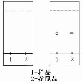 取一片硅膠板,在白色涂層面底端向上約1厘米處,用鉛筆畫(huà)一條直線(xiàn),取兩點(diǎn)分別作為樣品和參照品的點(diǎn)樣點(diǎn)(如圖所示)。取1支毛細管,將其下端浸入樣品上清液中,停留2秒后取出,與樣品點(diǎn)樣點(diǎn)垂直接觸。點(diǎn)樣斑點(diǎn)揮干后,再重復點(diǎn)樣一次(斑點(diǎn)直徑控制在5毫米以?xún)龋?。另取毛細管取參照品溶液在參照品點(diǎn)樣處進(jìn)行點(diǎn)樣,晾干后備用。