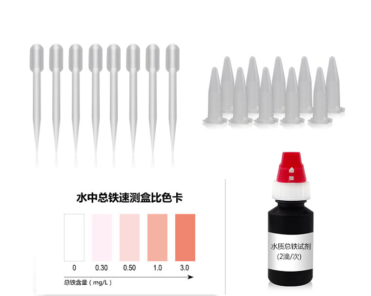 水中鐵離子與檢測試劑反應生成橙紅色物質(zhì),含量越高顯色越深。