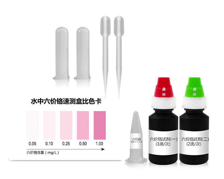 鉻(Cr)在其化合物中常見(jiàn)的價(jià)態(tài)有三價(jià)(Cr3+)和六價(jià)(Cr6+)兩種。六價(jià)鉻為吞入性毒物/吸入性極毒物,皮膚接觸可能導致過(guò)敏;更可能造成遺傳性基因缺陷,吸入可能致癌,對環(huán)境有持久危險性。其毒性比三價(jià)鉻高100 倍,且更易被人體吸收,在體內蓄積,對人體造成危害。本速測盒適用于生活飲用水及其水源水中六價(jià)鉻的快速檢測。