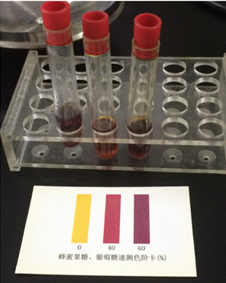 4.把樣品顯色管與果糖和葡萄糖比色卡比對,即可讀出樣品中果糖和葡萄糖的含量。1、3管為樣品,均大于60%,符合國家標準。