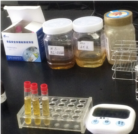1、取一支檢測管,加入約 1mL 蜂蜜樣品,加入約 3mL 的純凈水,振搖混溶,滴入 3 滴速測液,搖勻。