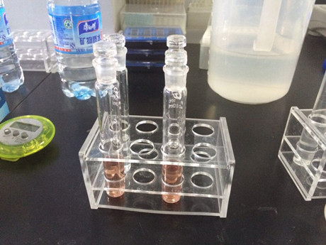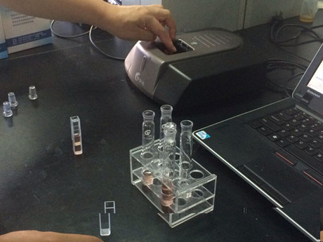 3、 樣品管:分別取0.4mL樣品液于10mL比色管中,做平行測試,分別加B溶液1mL、C溶液0.2mL,混勻,加D溶液0.4mL,搖勻,再加E溶液0.4mL,立即用蒸餾水稀釋至5mL刻線(xiàn),搖勻,靜置20min,進(jìn)行檢測??瞻坠埽翰患覧溶液,其余步驟與樣品管同。