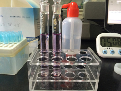 3、取一支10mL比色管,加入1mL樣品液,取一空白管內加入蒸餾水替代樣品液,分別加入C溶液80μL,加蒸餾水至10mL刻度線(xiàn),加入D溶液0.5mL,搖勻,開(kāi)蓋靜置10min。