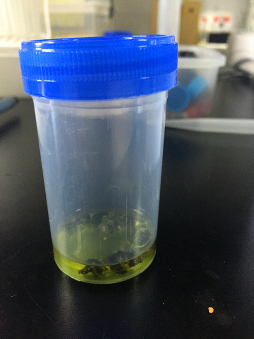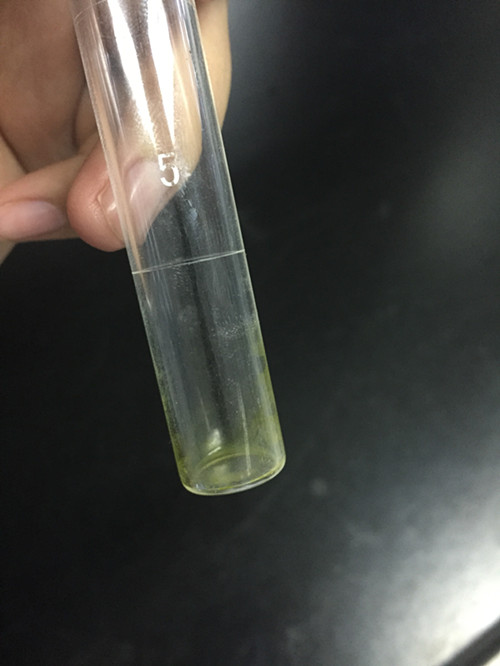 待上層容易清澈后,用移液槍移取0.5ml提取液到比色管中,之后用洗耳球吹干丙酮,得到附著(zhù)于比色管壁的綠色物質(zhì);