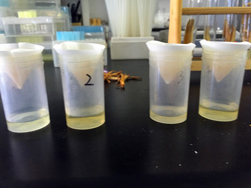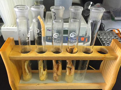首先我們將各個(gè)樣本的黃花菜每個(gè)稱(chēng)重1.25克放入25ml比色管中,加入0.5ml試劑C,加蒸餾水20mL,超聲浸提15min,由于上層溶液不澄清,加入A溶液和B溶液各0.5mL,然后加蒸餾水定容到25mL刻度線(xiàn),搖勻,靜置5min,過(guò)濾,濾液(即樣品液)備用。