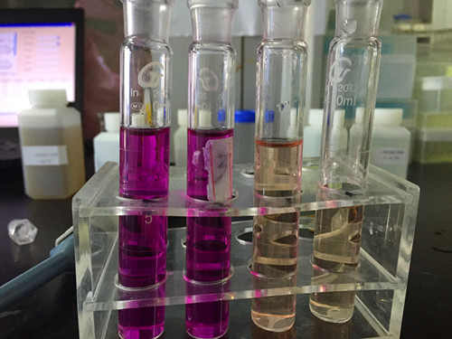 然后取一支10mL比色管,加入1mL樣品液,加入C溶液80μL,加蒸餾水至10mL刻度線(xiàn),加入D溶液0.5mL,搖勻,開(kāi)蓋靜置10min,加入F溶液0.5mL,迅速蓋塞顛倒兩次,迅速加入E溶液1mL,蓋塞混勻,靜置7min。處理完畢后作為樣品管??瞻坠埽嚎瞻坠軆燃尤胝麴s水替代樣品液,其余步驟與樣品管相同