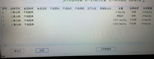 之后先用空白管校準,再檢測樣品管得到各個(gè)樣品二氧化硫含量都顯示只有2號為不添加二氧化硫的合格樣本,其他都添加了二氧化硫,但是其中1號為添加了少量二氧化硫的合格樣品,我國規定黃花菜中的二氧化硫的添加量為200 mg/kg,其他兩種含量分別為1907.1 mg/kg和1336.3 mg/kg,遠遠超出了我國的國家標準,為不合格產(chǎn)品。