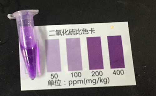 采用二氧化硫速測試管進(jìn)行檢測,稱(chēng)取1g枸杞樣本加入蒸餾水49ml,攪拌后靜置10min,之后轉移1ml到離心管中,加入2d二氧化硫檢測試劑A,1d二氧化硫檢測試劑B。攪拌均勻后,5分鐘后用離心管與比色卡進(jìn)行比色。發(fā)現用二氧化硫的存在。