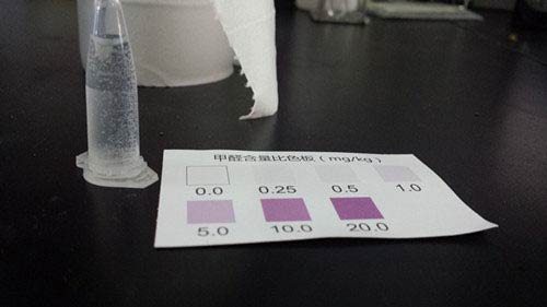 (3)結果:顏色相同或相近的比色卡色階示值為無(wú)色液體樣品中甲醛含量mg/L;顏色相同或相近的比色卡色階示值乘以10即為固體樣品中甲醛含量mg/kg。若顏色超出色