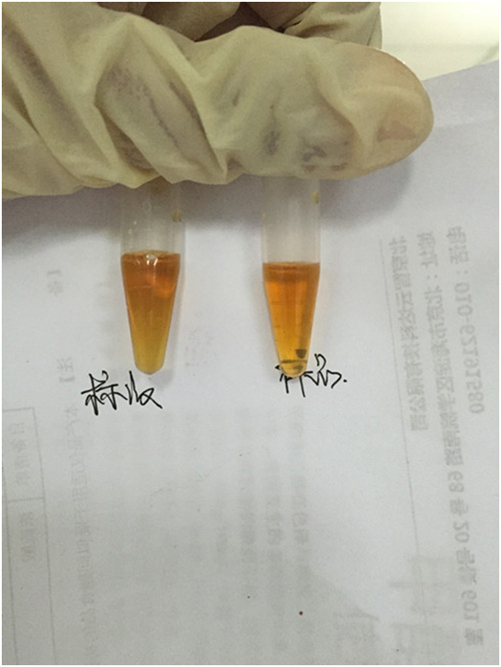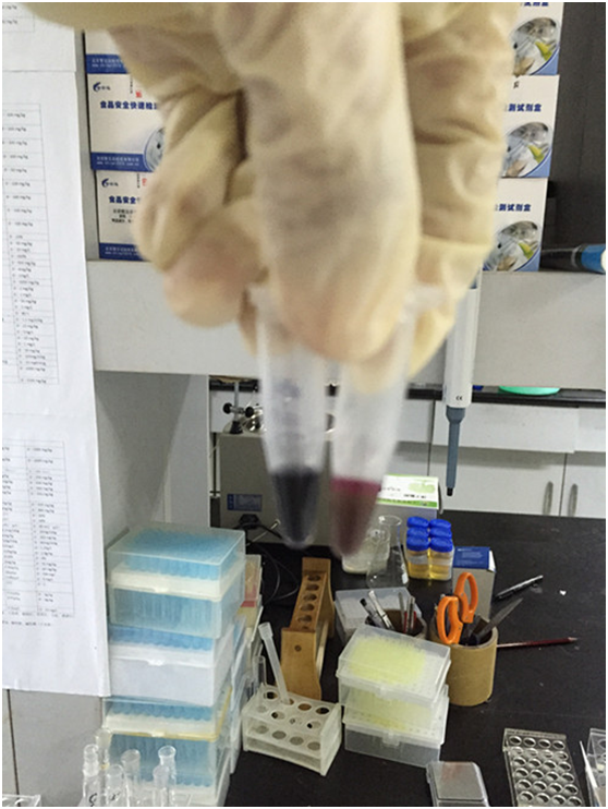 用滴管取0.04%甲醇標液、酒樣各6滴于兩個(gè)離心管中,各加入5滴試劑1,放置5分鐘。