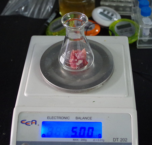 將樣品除去脂肪、骨及腱后,切碎攪勻,稱(chēng)取5 g,置于樣品瓶中。