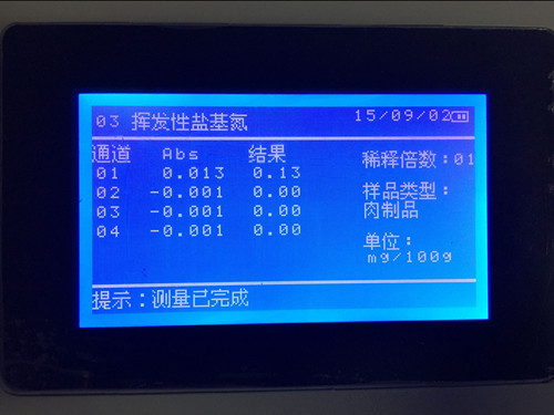 放入儀器中,檢測。檢測結果顯示揮發(fā)性鹽基氮含量。鮮(凍)畜肉≤15mg/100g,樣品中揮發(fā)性鹽基氮含量合格,符合國家標準。