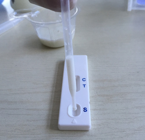 用干燥、潔凈的比色管盛放奶粉,用純凈水1:10稀釋?zhuān)?份奶粉+10份純凈水),溶解后用于檢測。