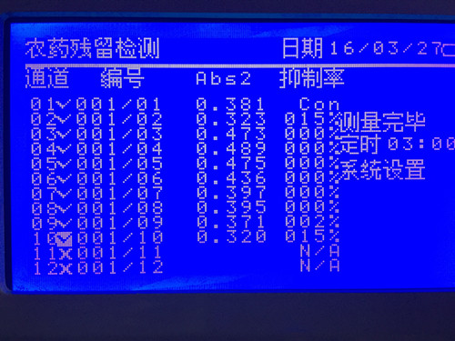 檢測結果如圖所示,結果以酶被抑制的程度,即抑制率表示。當果蔬樣品提取液對酶的抑制率為40~50%時(shí),則表明被測樣品為可疑農殘超標樣品;當抑制率≥50%時(shí),表示蔬菜中有高劑量有機磷或氨基甲酸酯類(lèi)農藥存在,樣品為陽(yáng)性結果。所以樣品中農藥殘留符合國家標準。