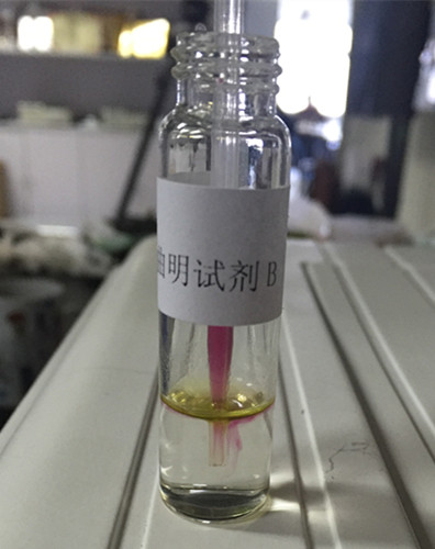 另取一支0.5 mL吸管,吸取試劑C至吸管細部前端約1/4處(約0.125 mL),插入至試劑B瓶的下層溶液中并緩慢排空,觀(guān)察B瓶下層溶液中是否產(chǎn)生渾濁絮狀物或沉淀物。