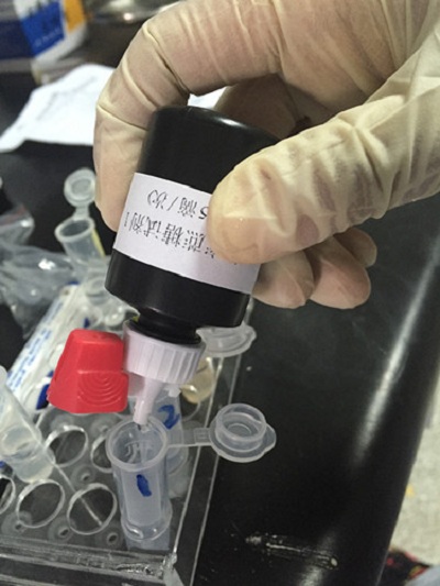 用0.2 mL塑料吸管取待測液滴加1滴到另一離心管中,滴入15滴蔗糖試劑1,蓋上管蓋,上下?lián)u動(dòng)6次。