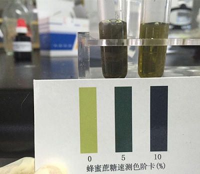 把離心管放入沸水浴中加熱5分鐘,取出與比色卡比對,讀出樣品中蔗糖的含量(%)。根據國家標準規定,桉樹(shù)蜂蜜、柑橘蜂蜜、紫苜蓿蜂蜜、荔枝蜂蜜、野桂花蜜中蔗糖應≤10 g/100 g,其他蜂蜜應≤5 g/100 g。結果顯示樣品中蔗糖含量符合國家標準。