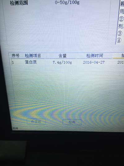 結果顯示,樣品中蛋白質(zhì)含量為7.4g/100g,與產(chǎn)品包裝標示不符合。